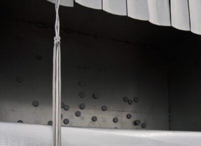 Crude welded seams, luminous silver, and black. Made-to-measure steel boxes dressed in wholesale shopping bags, ready for pick up: to shift, to migrate, to obliviate. None of them alike, yet all clearly related. Caves for lost plans and unfinished labour, where exhausted performance dissolves into patterns, morphing from the cosy to propaganda at extremis.
